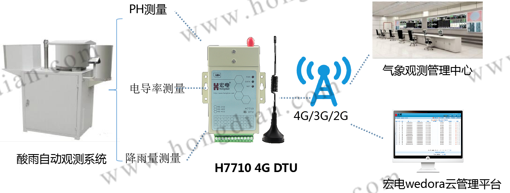 通過宏電H7710 DTU提供的無線網絡部署,靈活組網,與氣象觀測中心建立數據通道,實時傳輸現場觀測數據,并接收監測中心下發的診斷、維護、操作指令,H7710 DTU 采用模塊化設計,具有數據傳輸速率高、信號覆蓋范圍廣、實時性強、安全性高等優勢,4G無線網絡代替有線網絡,使酸雨自動觀測系統在任何地方都能夠聯網、自動觀測數據并進行數據采集,整個方案無需改變原有的系統構造,為后期設備升級提供便利。