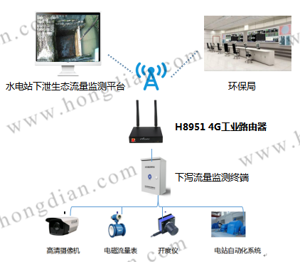 針對以上問題宏電提供基于4G 路由器無線通信的水電站下泄生態(tài)流量在線監(jiān)測方案,宏電H8951 4G路由器接入下瀉流量監(jiān)測終端,通過4G高速無線網絡實時將監(jiān)測終端采集到的水位、流量、現(xiàn)場視頻圖像、水電站運行狀態(tài)信息實時上傳到水電站下泄生態(tài)流量平臺和環(huán)保局,監(jiān)管部門可遠程進行實時的數(shù)據(jù)采集與設備控制,隨時掌握各水電站的流量下泄情況。