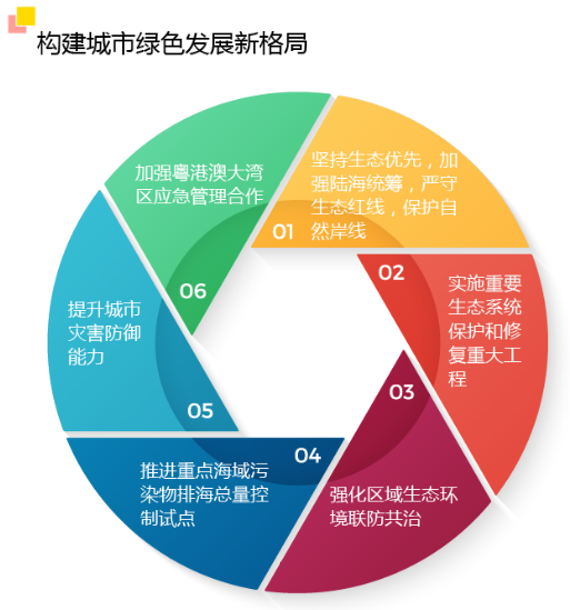 針對率先打造人與自然和諧共生的美麗中國典范,意見指出,構(gòu)建城市綠色發(fā)展新格局。堅持生態(tài)優(yōu)先,加強(qiáng)陸海統(tǒng)籌,嚴(yán)守生態(tài)紅線,保護(hù)自然岸線。實施重要生態(tài)系統(tǒng)保護(hù)和修復(fù)重大工程,強(qiáng)化區(qū)域生態(tài)環(huán)境聯(lián)防共治,推進(jìn)重點海域污染物排海總量控制試點。提升城市災(zāi)害防御能力,加強(qiáng)粵港澳大灣區(qū)應(yīng)急管理合作。加快建立綠色低碳循環(huán)發(fā)展的經(jīng)濟(jì)體系,構(gòu)建以市場為導(dǎo)向的綠色技術(shù)創(chuàng)新體系,大力發(fā)展綠色產(chǎn)業(yè),促進(jìn)綠色消費,發(fā)展綠色金融。繼續(xù)實施能源消耗總量和強(qiáng)度雙控行動,率先建成節(jié)水型城市。