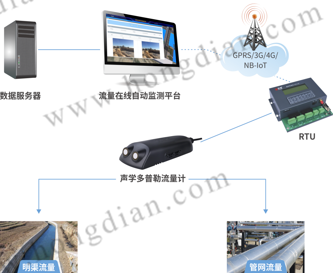 系統主要由現場采集單元、數據處理單元(測量主機)、通信網絡和監控中心數據服務平臺組成。系統由聲學多普勒流量計測量流體流速、水位、水溫和流量,遙測終端RTU將數據通過3G/4G/GPRS/SMS網絡傳輸至流量監測中心,監測中心結合相應的監控及分析軟件可實時對現場數據可視化監測,實現系統運行無人值守、有人管理的模式。