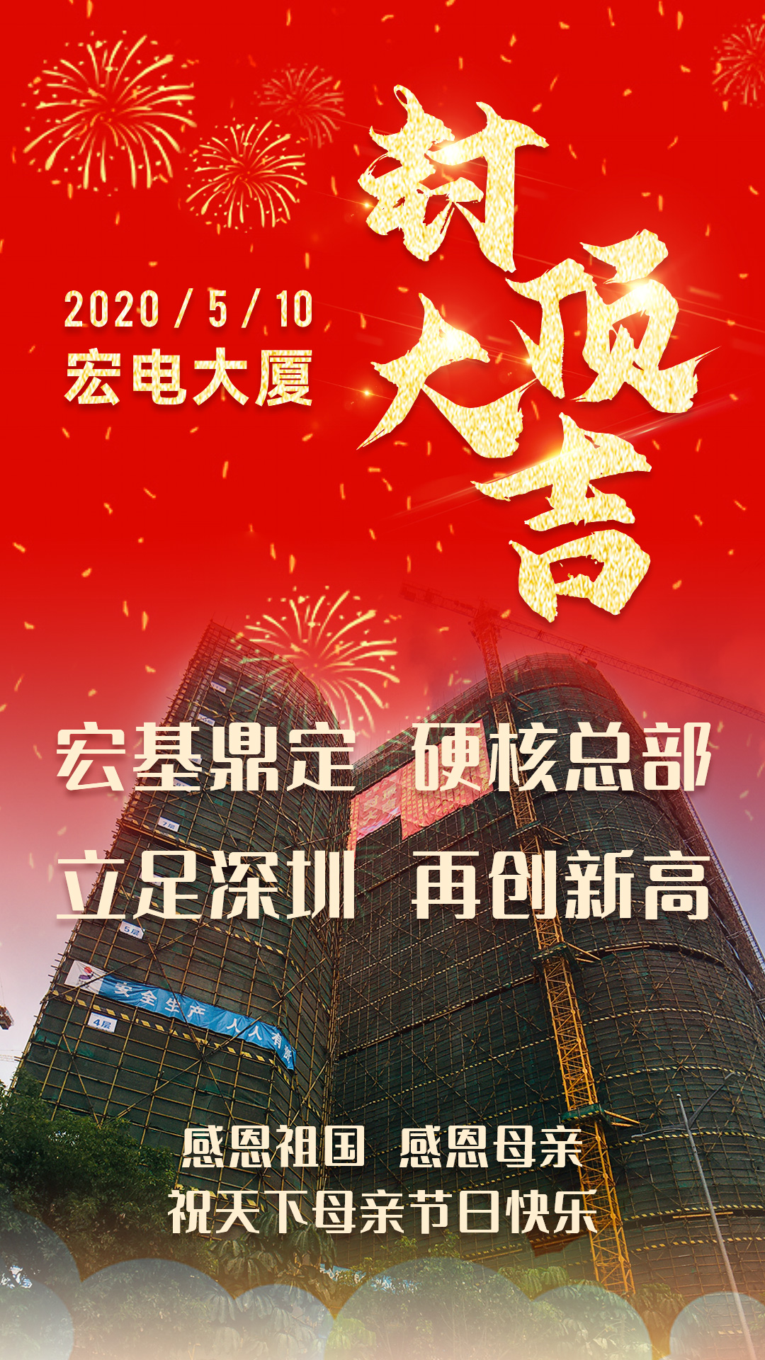 2017年12月26日毛主席誕辰紀念日,宏電大廈奠基;2020年5月10日母親節,宏電大廈主體結構封頂。在這個感恩的日子里,宏電感謝祖國母親,感謝深圳培育宏電的成長,感謝龍崗區給予宏電發展的空間。宏電大廈主體結構順利封頂,標志著宏電大廈建設進入了一個新階段。未來,宏電將繼續堅定不移地走科技創新發展路線,在開拓自身業務的同時,助力深圳的發展,為祖國的經濟繁榮做出貢獻。