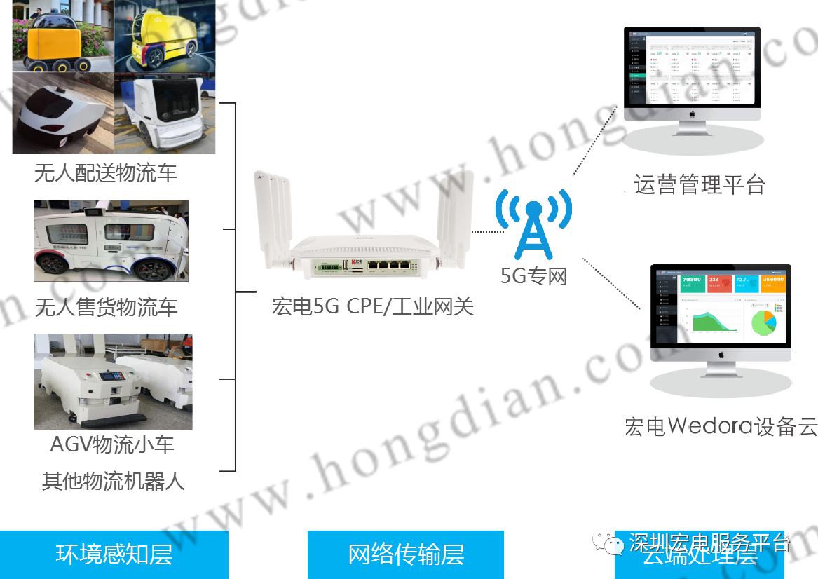 無人車可以感知周邊環境,進行路況分析,主動避讓障礙物,通過調度自動完成物流運輸和物資調撥,這其中宏電提供的無人物流車互聯互通方案起到了“連接”的關鍵作用,通過宏電5G CPE/工業網關,提供穩定、高質量、低時延的5G網絡連接服務,終端實時采集無人車的GPS定位、車輛狀態、零部件狀況、運行情況等數據,通過5G網絡傳輸回云端后對車況及車輛周邊環境進行綜合診斷。