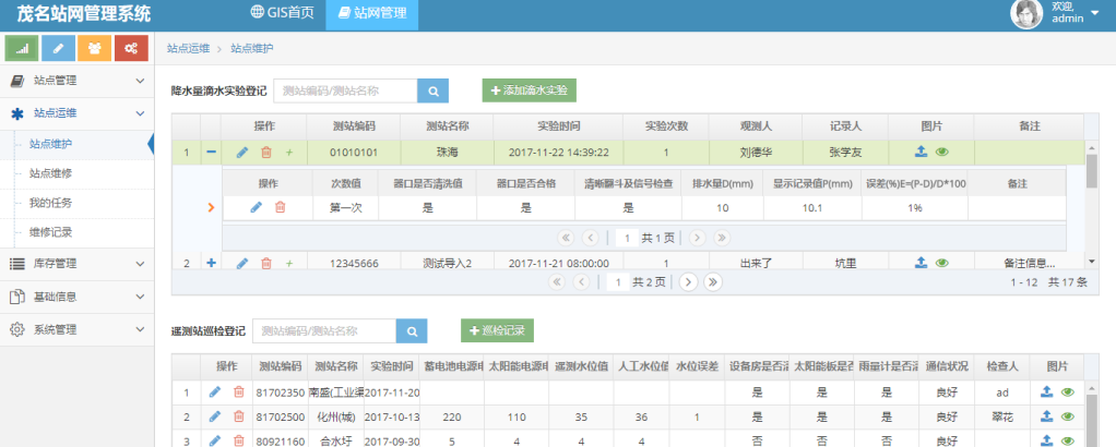 提供降水量滴水試驗登記表及巡檢記錄的增刪改查,實現巡查任務監控以及維護功能,實現測站設備運行狀況的監控以及維護功能,顯示維修任務人在完成維修后提交的維修記錄列表。