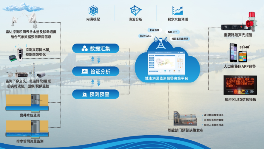 在空中、地表和地下管網,通過部署測雨雷達、雨量計、液位傳感器、流速流量傳感器、聲光報警器(可選)、圖像/視頻監控傳感器、遙測終端機和電源系統等,實時測量空中雨量、地表實際降雨量、監控區域實際液位、地下排水管網運行情況等信息,并可通過視頻/圖像抓拍進行狀態確認。