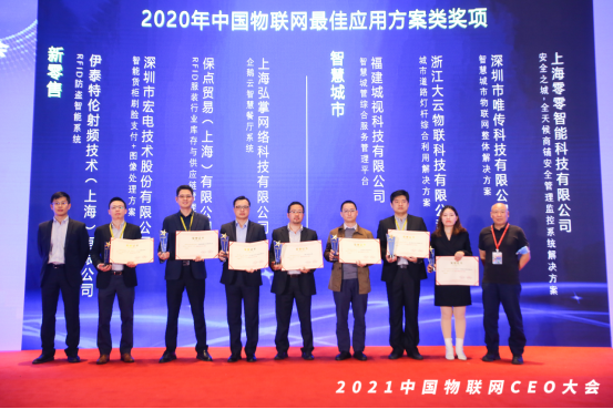 4月20日,2021中國物聯網CEO大會暨“物聯之星”頒獎盛典”在上海舉辦。大會對“2020年度物聯之星評選”獲獎企業進行了現場頒獎,宏電憑借24年物聯網無線通信經驗,強大的終端硬件+云平臺一站式物聯網服務能力,從400家評選企業中脫穎而出,連獲兩大獎項:2020年中國物聯網最具影響力云平臺企業獎和2020年中國物聯網最佳應用方案——新零售方案應用獎。