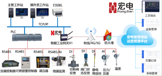 場站工藝裝置通過宏電智能工業網關X1打通網絡數據通道,接入宏電智慧場站運營管理平臺,實現場站設備數據的實時監測與動態調節,對工藝裝置運行安全進行智能管控。