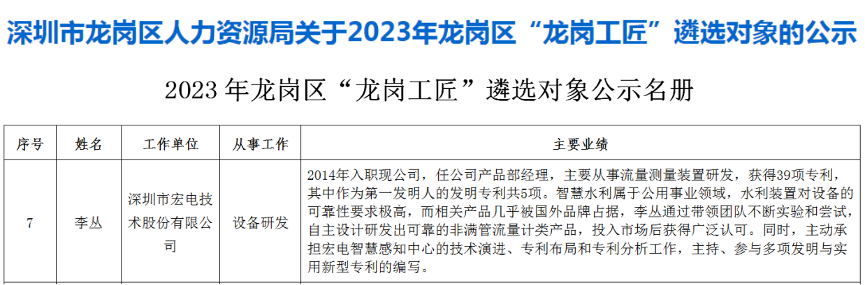 為弘揚勞模精神、勞動精神、工匠精神,營造尊重人才、崇尚技能的社會風尚,培養造就一批高素質的技能人才,推動龍崗經濟高質量發展,深圳市龍崗區人力資源局組織了“2023年龍崗區‘龍崗工匠’遴選”,宏電股份智慧感知產品經理李叢當選。