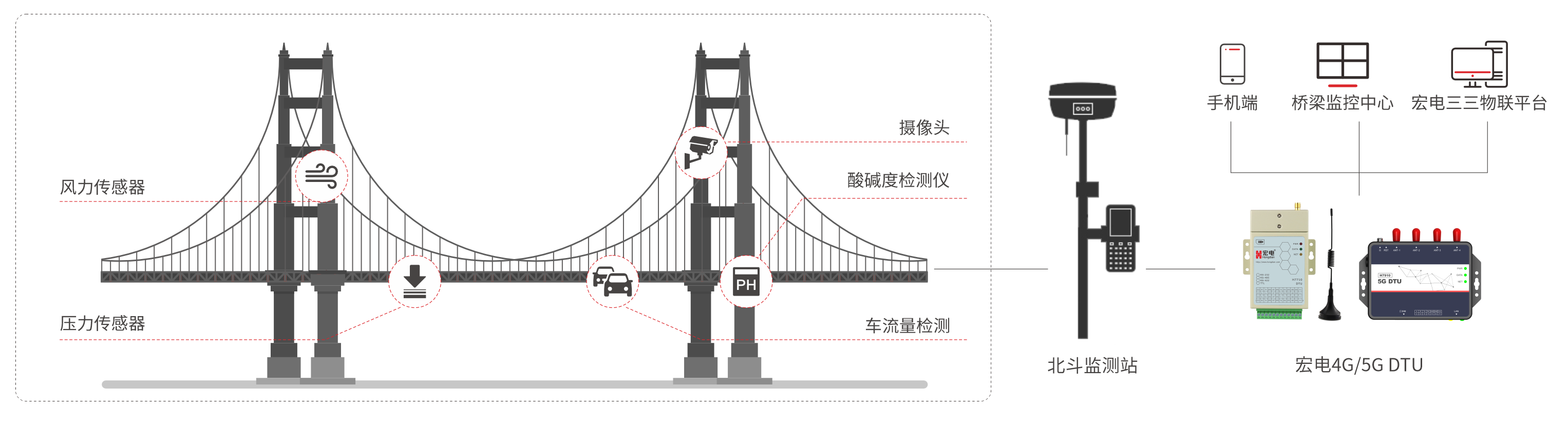 傳統橋梁檢測和評估有很大的不足,全憑人工巡查,效率不高,也不夠精準,傳統的形變監測手段越來越不能滿足形變監測要求,迫切需要性能更可靠的設備來監測大橋的形變。為實現橋梁實時監測,保障橋梁安全,宏電聯合北斗導航定位相關企業,推出北斗橋梁形變監測預警系統,根據橋梁實際情況結合高精度北斗形變監測技術、物聯網技術等實現對橋梁沉降、位移、傾斜、撓度等變形的自動化在線監測預警。