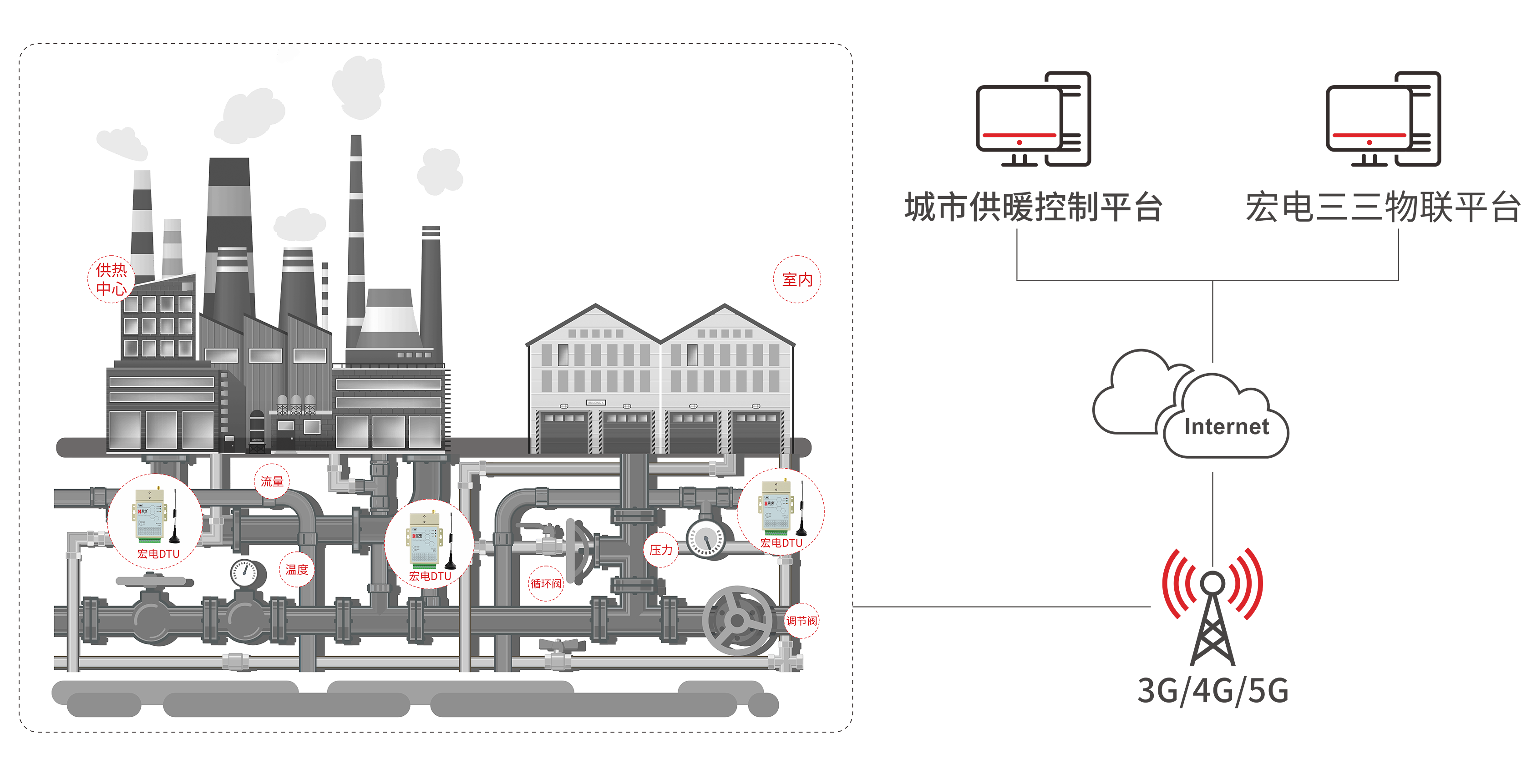方案以宏電4G/5G DTU為載體,在感知端接入溫度、壓力、流量等傳感器作為感知設備,將采集到的供熱設備的電壓、電流、壓力、溫度、流量、運轉狀態、運行參數監測與調節、安全防盜等數據通過宏電4G/5G DTU實時傳輸到遠程監控平臺。