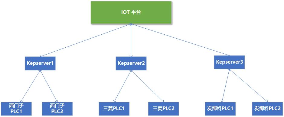在工業現場,一個很常見的方案是,利用 Kepserver 豐富的協議驅動采集各種品牌PLC、傳感器、控制器的數據,再使用 Kepserver 的OPC UA功能將數據通過OPC UA服務端發布出來,上層平臺通過OPC UA服務端獲取各設備的數據,而無需對接種類眾多、協議多種多樣的各類設備。這樣,有效的將 Kepserver 的優勢(協議庫豐富)和平臺的優勢(數據存儲、計算、分析、展示)結合,形成了一套保護既往投資、穩定、擴展性好的工業數據平臺解決方案。如下圖: