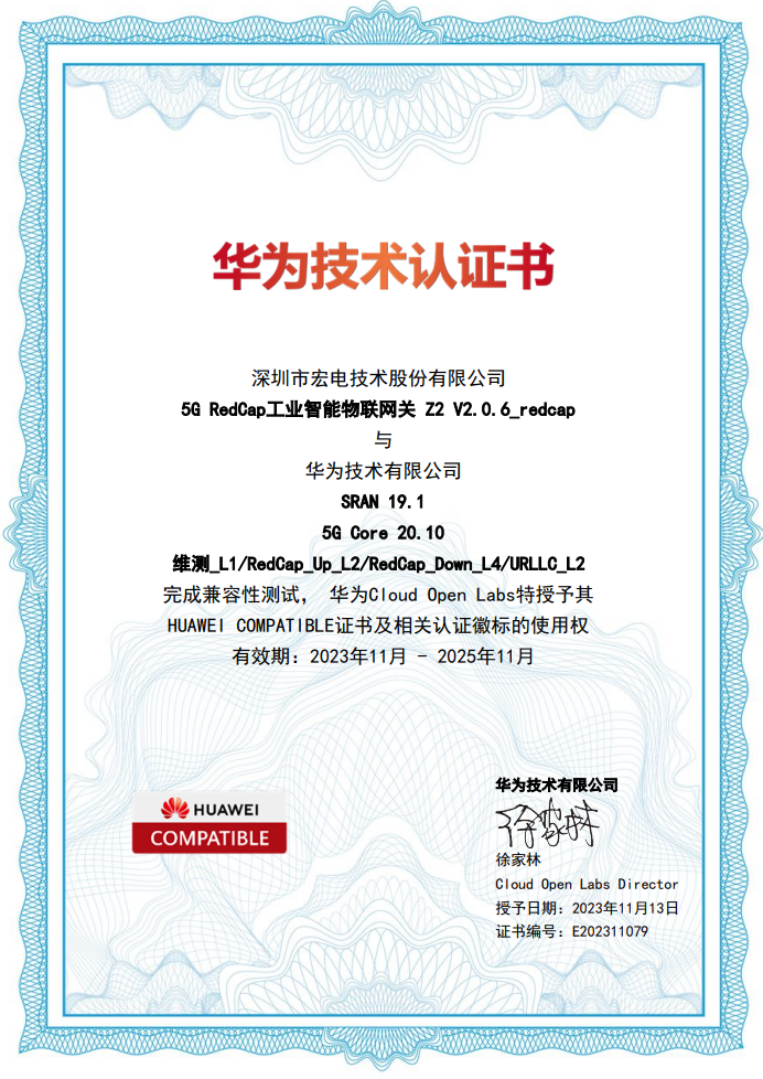 近日,宏電Z2 V20 5G RedCap工業智能網關率先通過華為OpenLab全球開放實驗室的系列嚴格驗證流程,完成基于華為RedCap終端場景的兼容性測試,首個獲得華為Cloud Open Labs授予的HUAWEI COMPATIBLE證書及其相關認證徽標使用權。