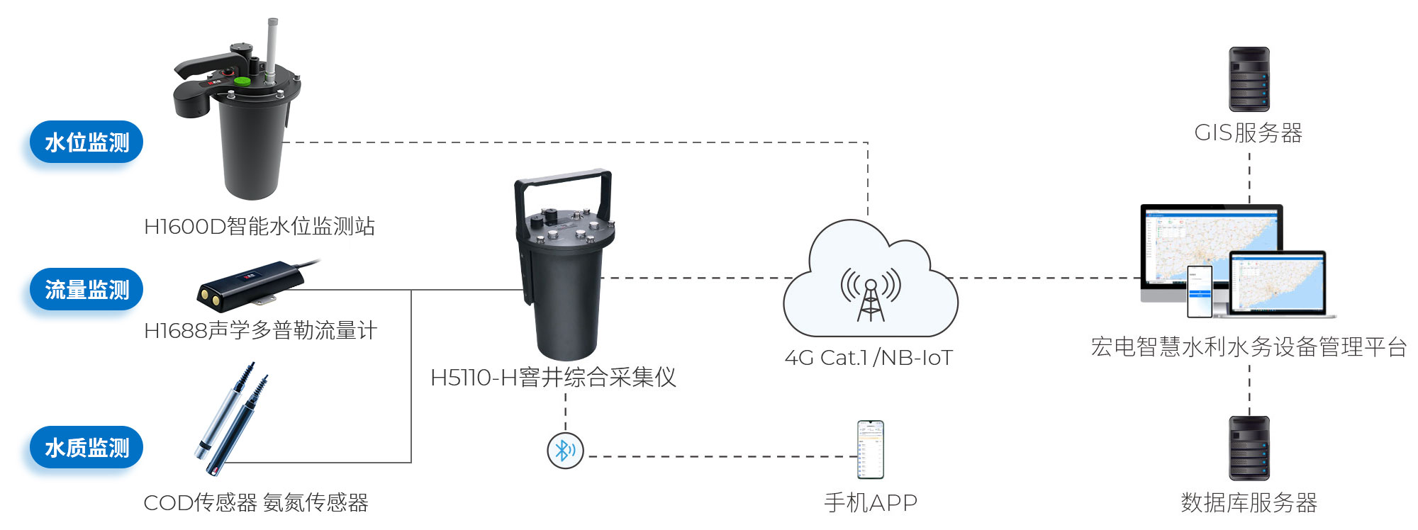 在窨井內(nèi)安裝宏電“窨井水位監(jiān)測衛(wèi)士”H1600D智能水位監(jiān)測站,實現(xiàn)水位數(shù)據(jù)的自動采集,并通過4G Cat.1/NB-IoT無線網(wǎng)絡(luò)傳輸至監(jiān)測平臺,實現(xiàn)水位數(shù)據(jù)的準確性、完整性、及時性和可靠性監(jiān)測。