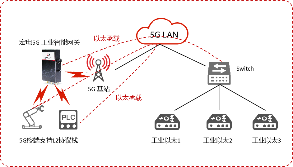 5G LAN是基于5G無線技術構建的局域網,可以實現高速、低延遲和高可靠的無線數據傳輸。與傳統的有線或無線局域網相比,5G LAN支持以太組網、局域網管理、廣域互聯等功能。如在工業遠程控制場景,有上下行/南北向二層流量,但普通5G僅支持L3互通,不支持L2協議棧,無法承載二層流量,需要部署AR路由器才能實現L3到L2的轉換,部署復雜成本高。宏電5G工業智能網關、5G工業路由器、5GDTU均可利用5G技術將終端進行“分組”、“建群”,組成一個LAN網絡,實現二層網絡數據傳輸,不需要新增AR路由器等隧道設備來配置虛擬二層網絡,使5G直接進入到工廠內網。