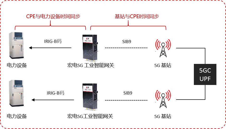 5G網絡授時技術可以實現基站之間、基站與終端設備之間的高精度時間同步。這種時間同步可以提升網絡的傳輸速率和可靠性。例如在電力差動保護中,差動保護裝置通過比較電力系統中兩個或多個區域之間的電流差異來檢測和切除故障。當電流差異超過設定值時,差動保護裝置會啟動,切斷故障電路,以保護電力系統的安全穩定運行。宏電5G工業智能網關通過SIB9消息獲取當前時鐘信息,再通過IRIG-B碼的方式脈沖到電力終端,兩臺網關輸出時間差僅為10us左右,快速點對點傳輸,幫助差動保護裝置完成故障自愈。